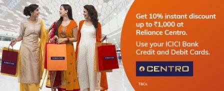 - The offer will be valid during the promotion period only which will be at the sole discretion of Reliance Retail Limited (Centro) and ICICI Bank.